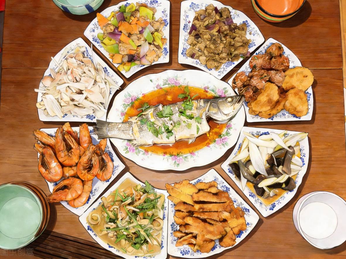 على الرغم من أن المناطق الشمالية والجنوبية في الصين لها تقاليدها الخاصة في الطهي، فمن المؤكد أن الطعام يُعطى معنى خاصًا في عشاء ليلة رأس السنة الجديدة. مثل السمك يعني الرغبة في الرخاء عاماً بعد عام، فإن الخس يبدو وكأنه الثراء في اللغة الصينية.