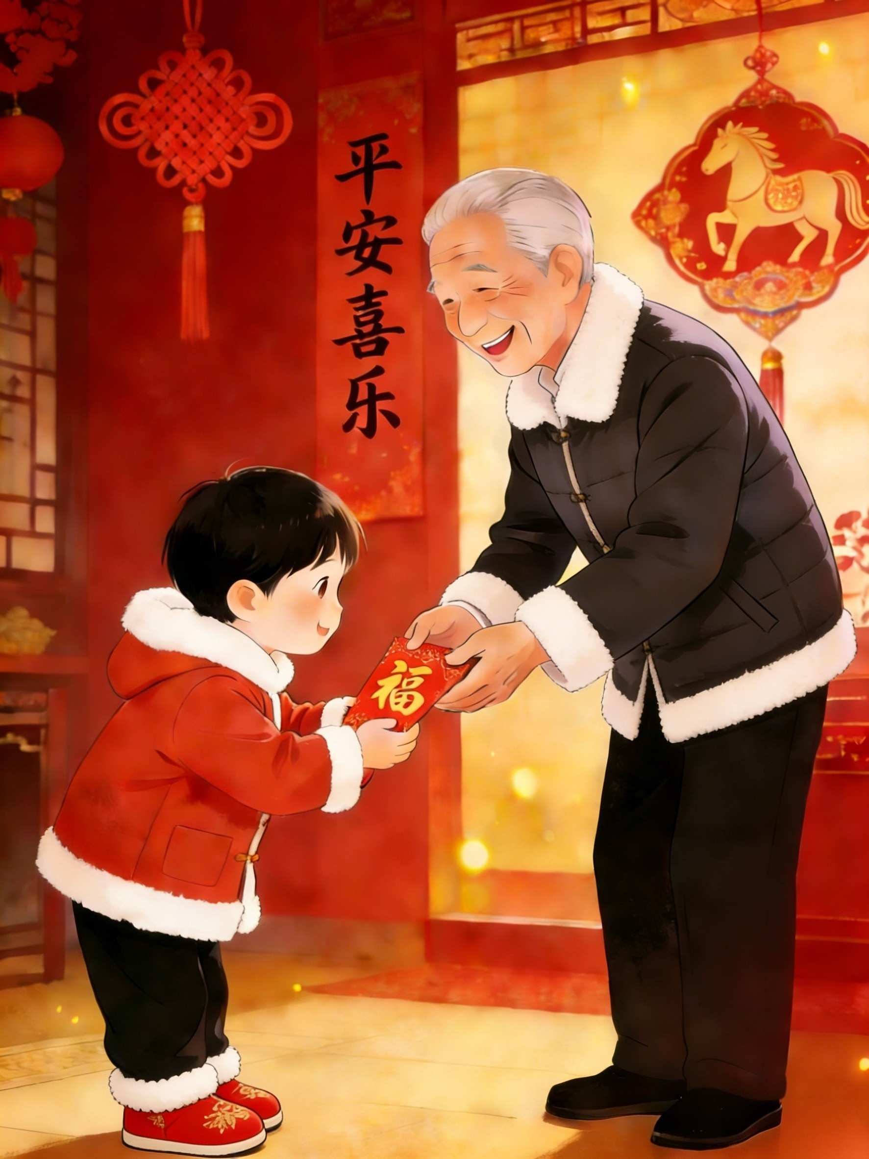 بعد العشاء، من العادات الأكثر شيوعًا أن يتلقى الأطفال أموالًا محظوظة في مظاريف حمراء من الآباء والأجداد أو الأقارب الآخرين.